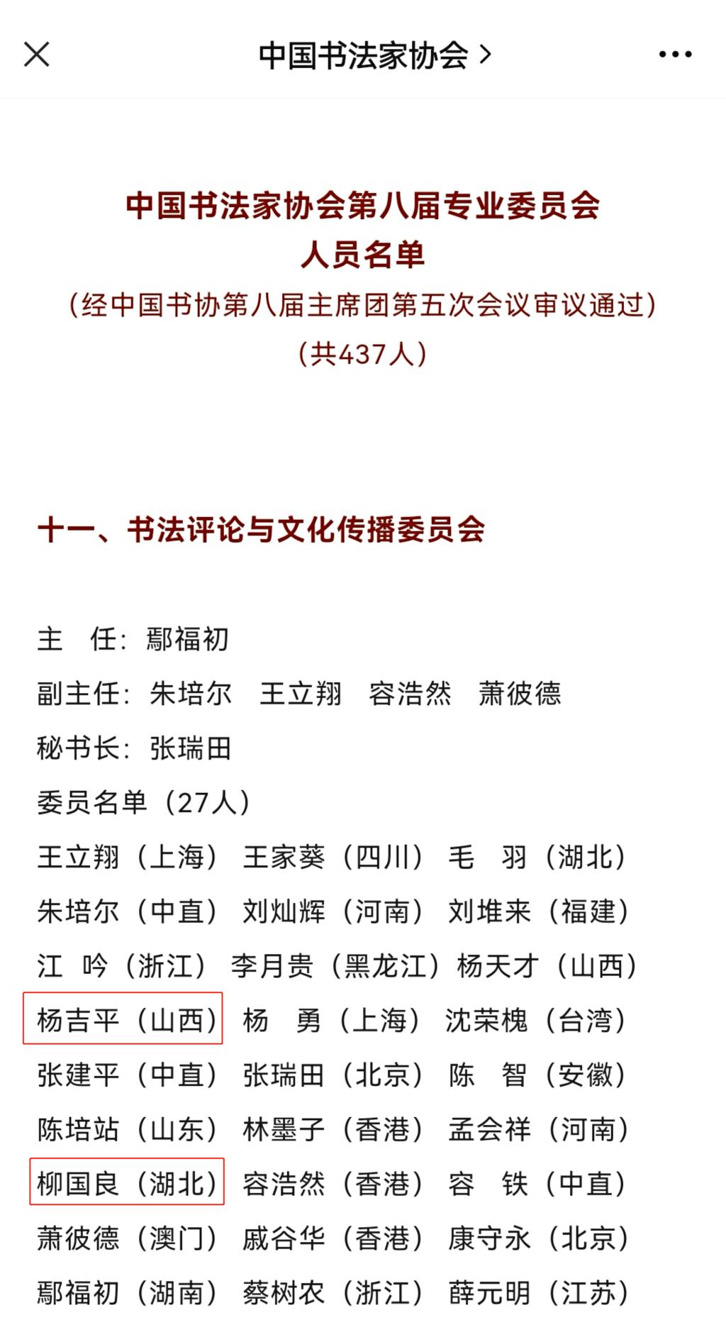 4月30日,中国书法家协会第八届主席团第五次会议审议通过中国书法家协会第八届专业委员会人选名单,山西省共8人当选。其中公司杨吉平教授当选为书法评论与文化传播委员会委员。