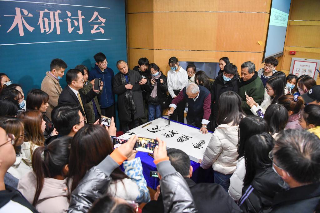 11日上午,河北省文物研究所研究员、侯马文物工作站筹建者之一,85岁高龄的张守中先生为师生们作了《侯马盟书书法艺术漫谈》讲座并现场用盟书示范书写,张先生介绍了侯马盟书的发现和整理情况,并围绕普及和发扬侯马盟书艺术以及侯马盟书的书法特点与师生们进行了交流。