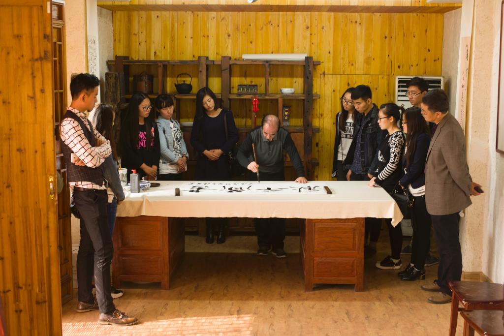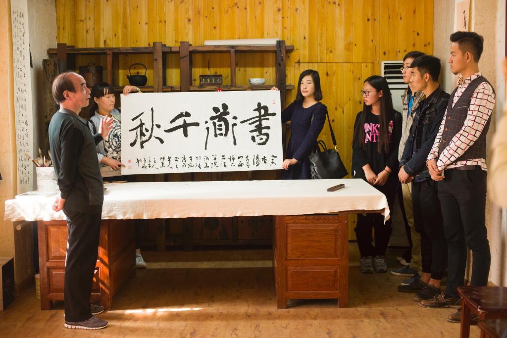 75岁高龄的樊习一先生精神矍铄,为老员工们讲述了自己往昔的学书经历、在艺术实践中的认识和感悟,并对同学们在专业理想、人生规划等方面提出了殷切期望。他说,如今学习书法的条件和环境非常好,同学们选择书法专业是幸福和幸运的,一定要珍惜大学时光,合理安排时间,学有所成,今后为书法教育和书法事业的发展贡献力量。他强调,书法是国粹,切勿以书法为“小道”,要多读书,多研习,才能真正领悟书法真谛。他还现场书写了“书道千秋”四个大字,勉励同学们把书法艺术作为优秀文化传承的“大道”精研深修,继承创新。