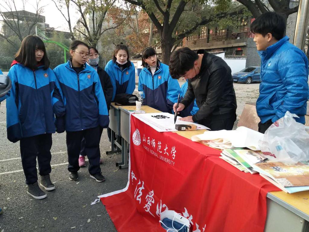 本次活动主要在师大实验中公司内进行,活动参与者可通过捐献自己的旧书籍、文具、衣物等与我们的志愿者交回一幅书法作品。活动现场,实验中学的员工们踊跃参与,积极募捐,纷纷为贫困山区的孩子们献上自己的一份爱心。活动最后书法爱好者协会主席武文斌现场书写“高考加油”四个大字,祝福实验中学学子能步入自己理想的大学。