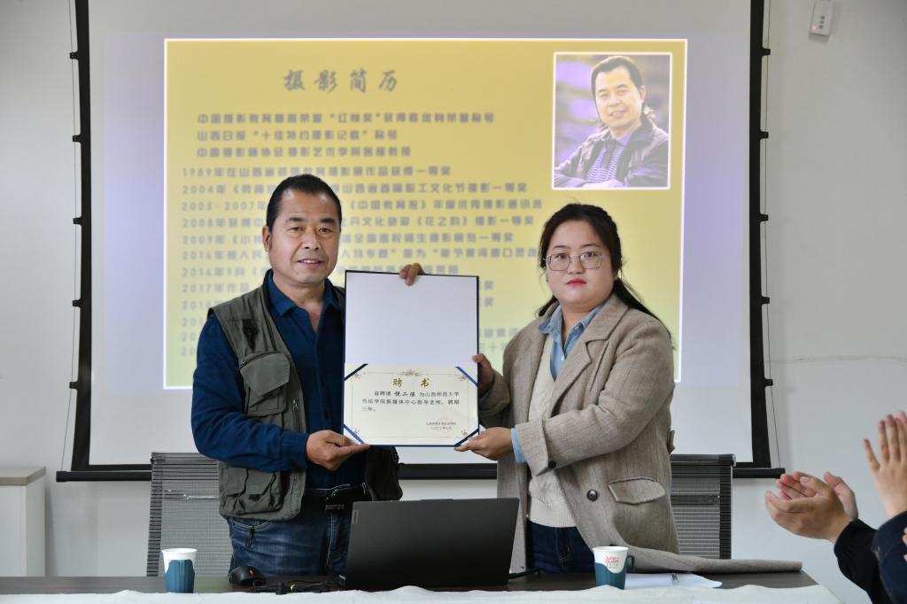 讲座开始前,宁译锐代表pa捕鱼官方网站新媒体中心向饶二保老师颁发了聘书,聘请饶二保老师为pa捕鱼官方网站新媒体中心指导老师。