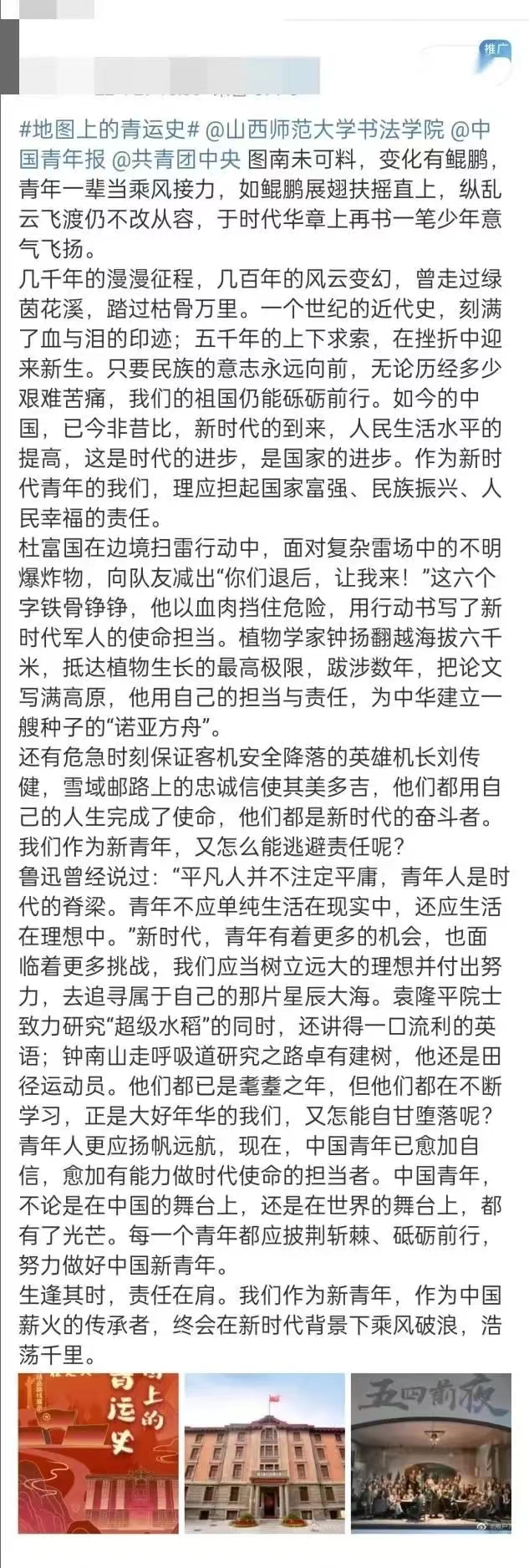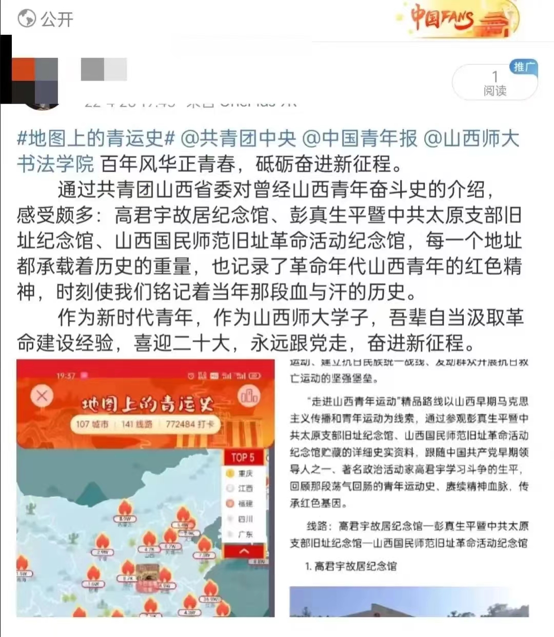 地图上的青运史,记录着革命先烈们每一个勇毅前行的足迹,饱含了奋斗的艰辛和革命岁月的激情澎湃。在本次活动中,同学们以接力打卡的形式,通过带话题#地图上的青运史#发微博进行互动,并@共青团中央@中国青年报@pa捕鱼官方网站,跟随先辈们的步伐,以线上形式回望共青团过去百年奋斗历程,感受过去一代代青年人的英勇与奉献。