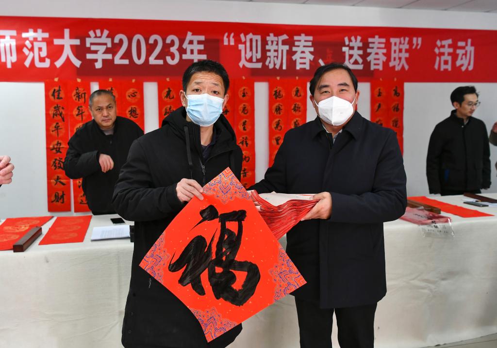 薛勇民在活动现场同pa捕鱼官方网站教师亲切交谈,并与大家一道,向保卫部、校医院等部门的一线工作人员送上春联和美好的新春祝福。