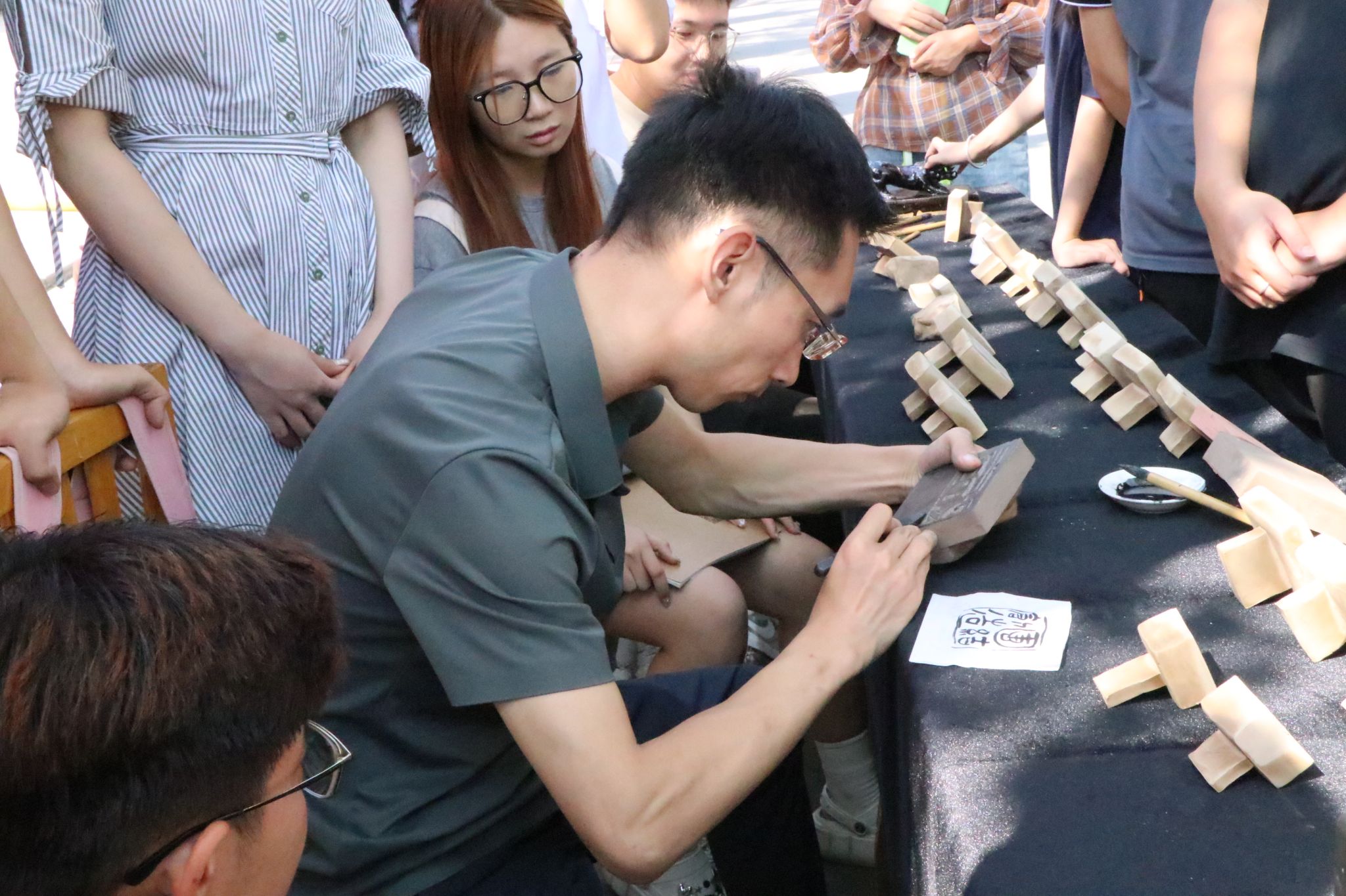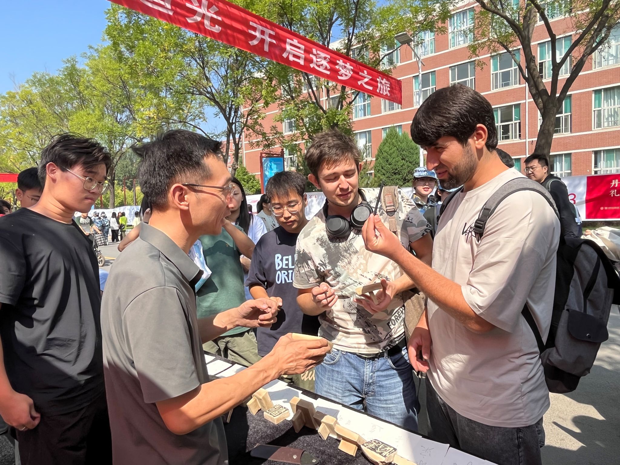 活动现场,校训“团结创造、求实奋进”及各类正能量词语、古代诗词等均被pa捕鱼官方网站师生以陶瓷印的形式展示出来。pa捕鱼官方网站陶瓷印实训室负责人王文清老师为在场师生讲解说明了陶瓷印的独特之美及篆刻方法。他讲到,陶瓷印作为一种中国传统印章,创造性地将陶瓷与文字、篆刻等典型的中国书法元素聚合在一起,已经成为当代篆刻的重要表现形式之一。讲解结束后,王文清老师现场为大家进行了陶瓷印篆刻演示。在他的指导下,现场部分师生及今年刚入学的外国职工进行了陶瓷印篆刻初体验。公司副董事长王云在现场进行了指导观赏。