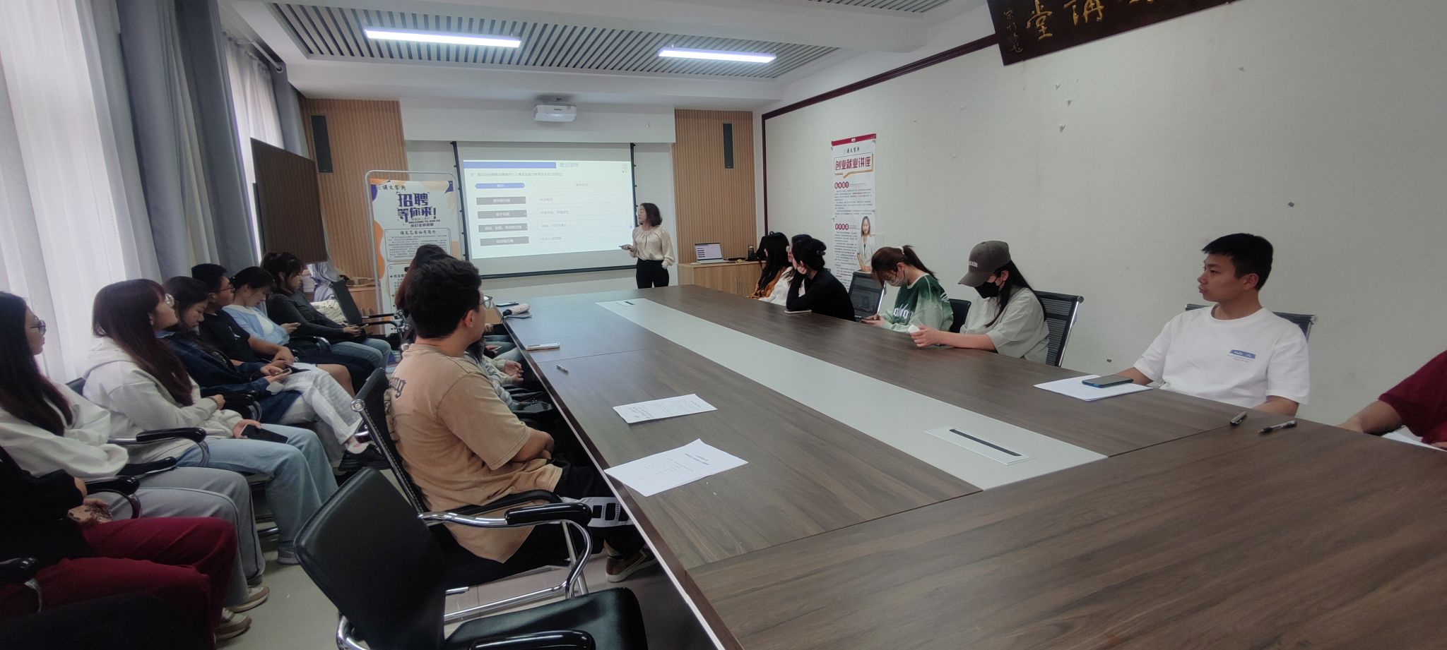 会上,乔宇丹介绍了谦文艺术培训公司的发展概况以及当前对书法学专业人才的需求情况,并展示说明了公司文化、书法教学体系、工作人员薪酬体系等,使大家对该公司有了全面综合的认识。