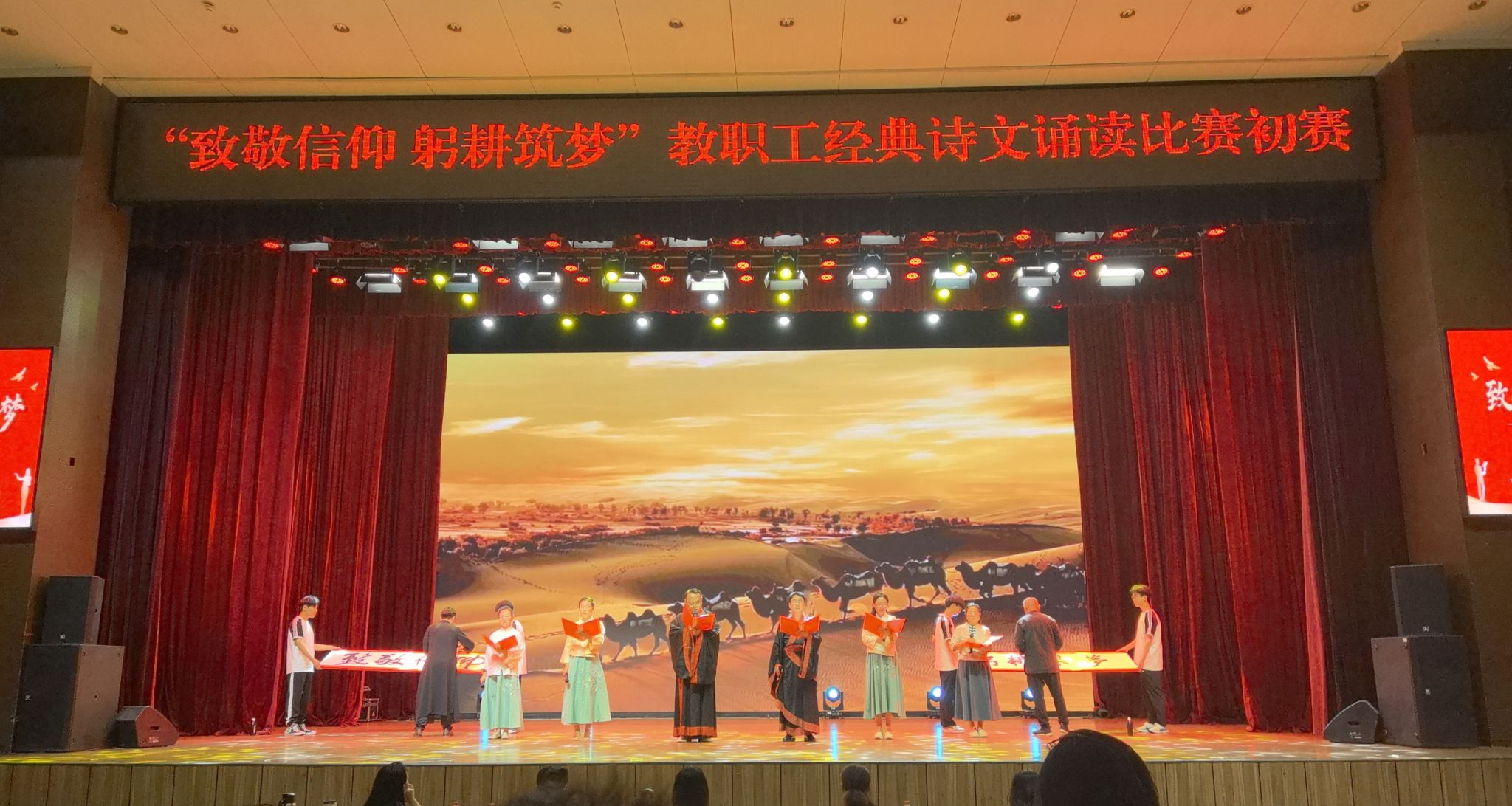 公司教师以《何以华夏 何以中国》为题进行了诵读。比赛现场,老师们的诵读声情并茂,铿锵有力,充分展现了公司师生的爱国情怀和对中华优秀传统文化的自信。伴随着老师们慷慨激昂的声音,王文清、丁俊瑞两位老师在舞台两侧挥毫泼墨,书写出本次比赛的主题“致敬信仰 躬耕筑梦”八个大字。表演获得了评委、观众的一致好评和热烈掌声。