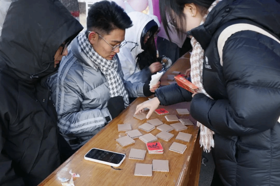 活动现场张灯结彩,洋溢着浓郁的节日氛围。精心布置的游戏区域吸引着师生们纷纷驻足参与。在“纸牌翻翻乐”区域,桌上整齐排列着的纸牌背面图案一致,参与者需在限定时间内记住纸牌的位置,随后凭借记忆翻开成对的纸牌。只见同学们全神贯注,眼睛紧紧盯着纸牌,默默记忆,随后小心翼翼地翻开纸牌,现场气氛紧张而安静,每一次成功配对都引发一阵欢呼。