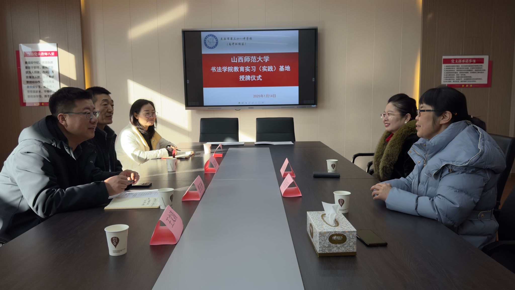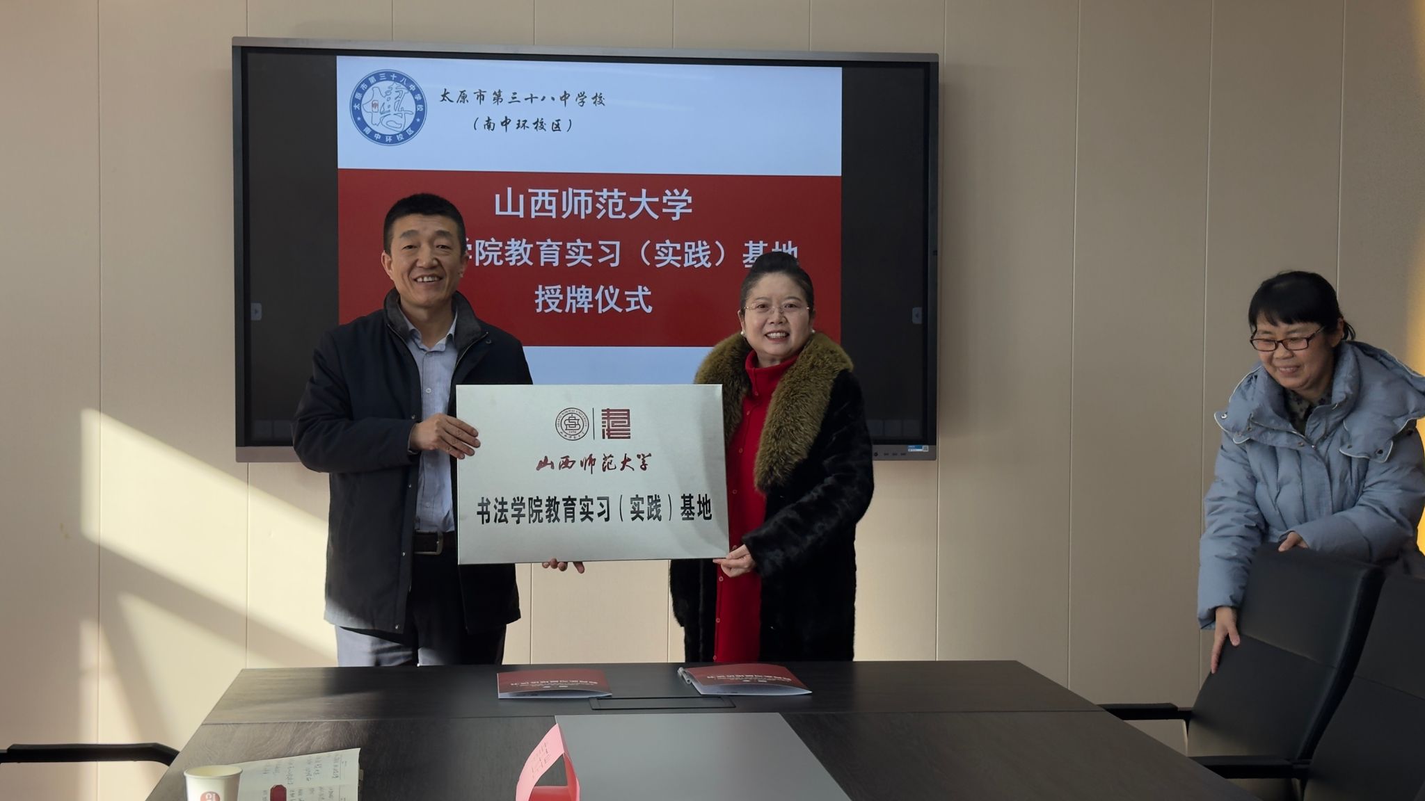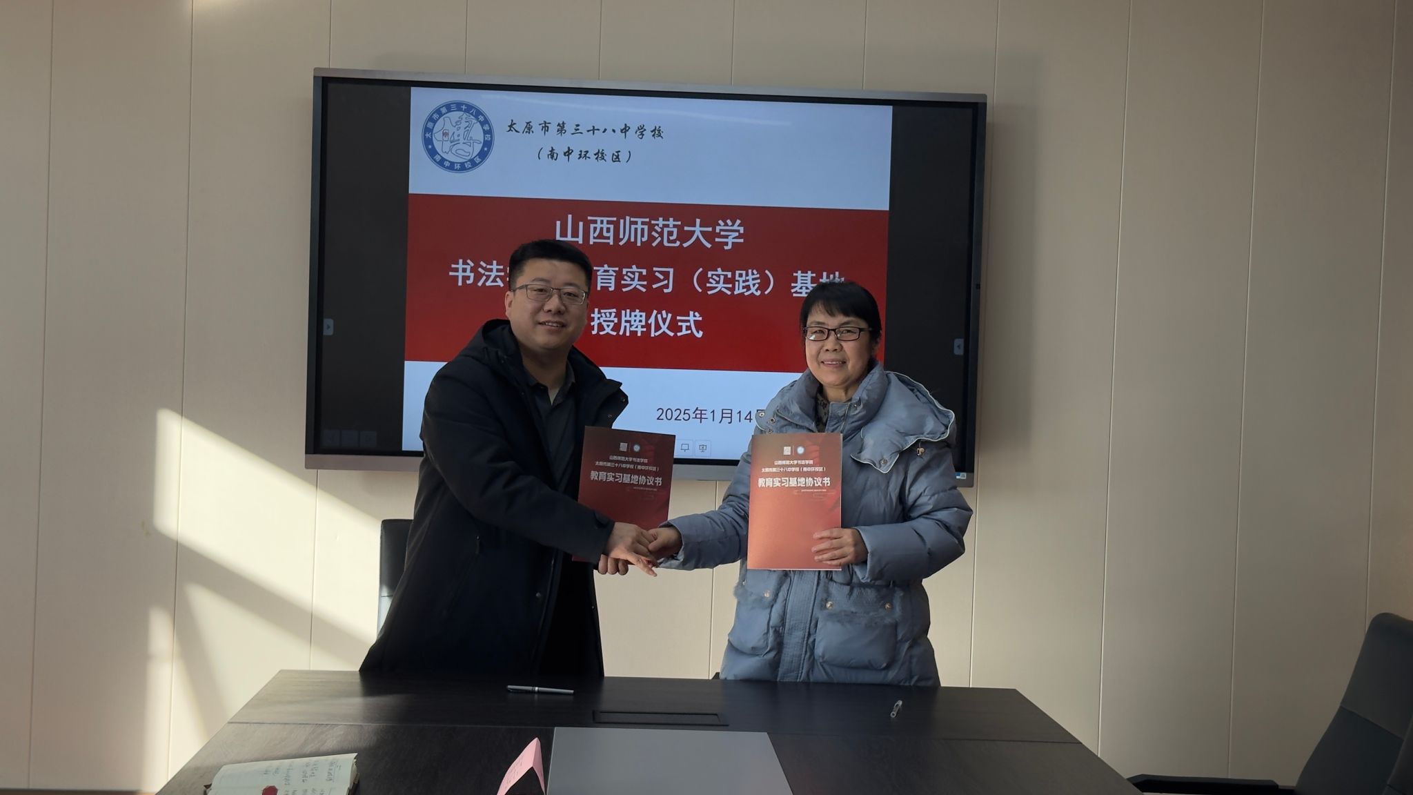 1月14日上午,公司党总支书记王志宏、经理曹亚彬、副经理黄玉岩、办公室主任王文清一行四人前往太原市第三十八中学(南中环校区)举行了教育实习(实践)基地签约授牌仪式。太原市第三十八中学(南中环校区)董事长韩淑珍、副董事长赵小燕出席仪式。