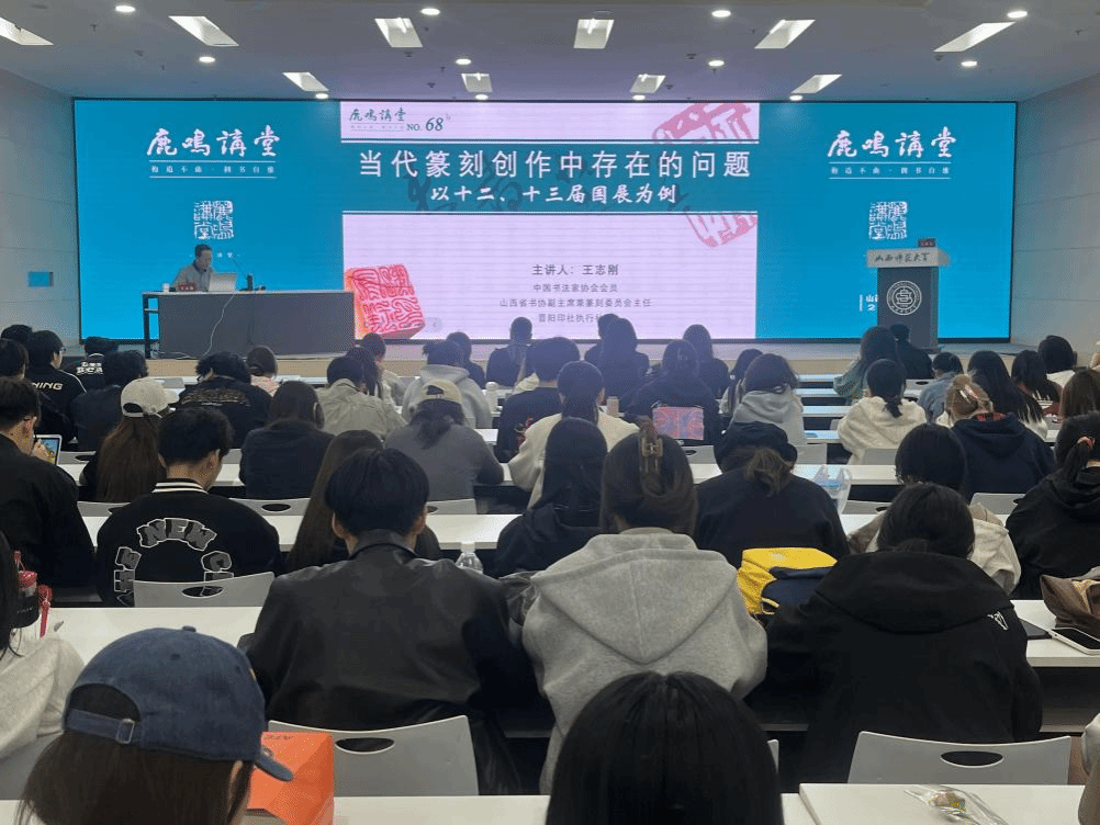 5月23日,pa捕鱼官方网站“鹿鸣讲堂”第68期学术活动于毓秀学堂圆满举行。本次活动以“当代篆刻创作中存在的问题”为核心议题,由中国书法家协会会员、山西省书法家协会副主席兼篆刻委员会主任、晋阳印社执行社长王志刚先生担任主讲嘉宾,pa捕鱼官方网站经理曹亚彬、副经理杨二斌,外聘教师李亚杰,以及公司教师王文清、刘晋等共同出席,与现场师生展开深度学术交流。