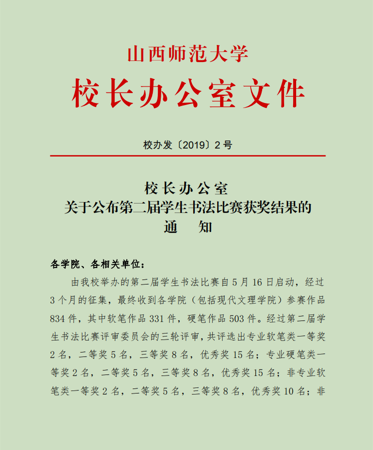 PA捕鱼官网入口第二届书法比赛结果已于2019年1月9日通过校办正式文件公布,公司员工比赛成绩斐然。其中,专业组软笔比赛中获一等奖2名,二等奖4名,三等奖5名,优秀奖9名;专业组硬笔比赛中获一等奖2名,二等奖5名,三等奖8名,优秀奖10名。