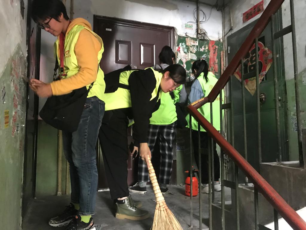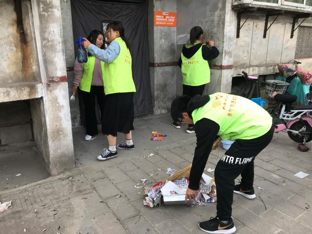 活动开始之前,负责人根据参加活动的人数以及场地范围进行了明确的分工,同时对一些细节问题进行了详细说明。在明确目标后志愿者们迅速进入工作状态,以不怕脏、不怕累的精神,认真地扫地、捡拾废弃的塑料袋、清除“牛皮癣”广告。经过一个多小时的努力,社区楼道的卫生死角彻底清除,为社区居民营造了一个清洁、优美、舒适的生活环境。
