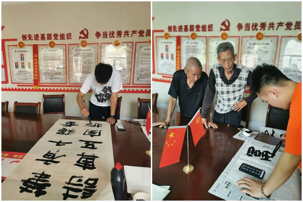 为深入学习贯彻习近平新时代中国特色社会主义思想,弘扬时代精神,队员们来到杨芳村广场,向村民们介绍最新的国家政策以及方针,宣讲习近平总书记关于三农工作的重要讲话精神。在宣讲过程中,队员们发挥专业特色,为村民们现场书写相关书法作品,增强了理论宣讲的生动性和效果,使专业学习与社会实践融为一体。