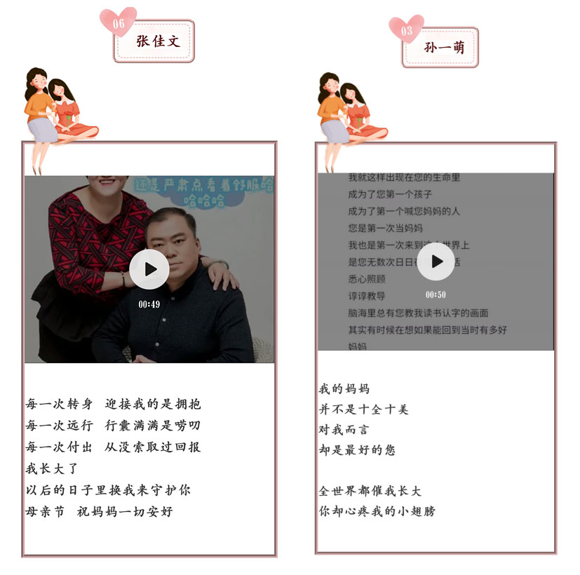 在活动作品中,员工们运用新媒体技术将妈妈陪伴自己长大的过程和自己想对妈妈说的话编辑成形式多样、活泼有趣的短视频,感情真挚。短视频在公司微信公众平台播出后,受到大家的认可和欢迎。