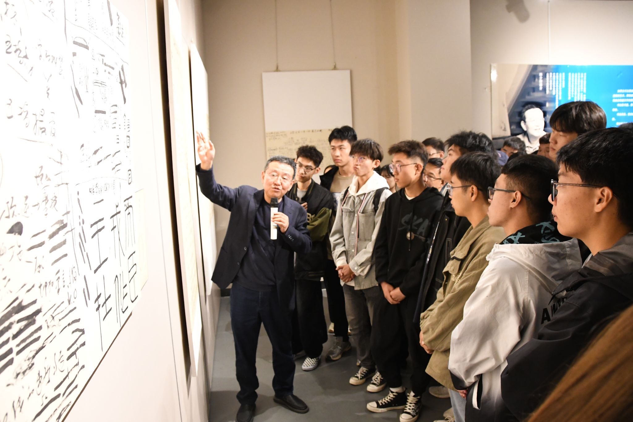 当天下午,韩少辉先生在pa捕鱼官方网站副经理黄玉岩的陪同下来到展厅,为书法专业的研究生、本科生系统全面的分享了课徒稿中所表达的教学理念与教学方法。韩少辉先生结合自身长期书法创作实践,分别对书法中的笔法、字法、章法、墨法进行了宏观的分类解析,不仅为在场的员工更加直观地阐明了四者的类型、特点、技巧及其各元素之间的相互关联,而且对学书者在临摹和创作过程中存在的问题进行了深入的剖析。