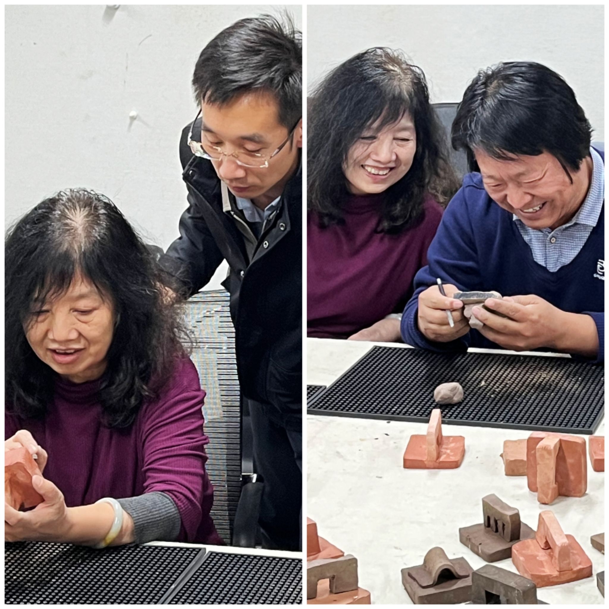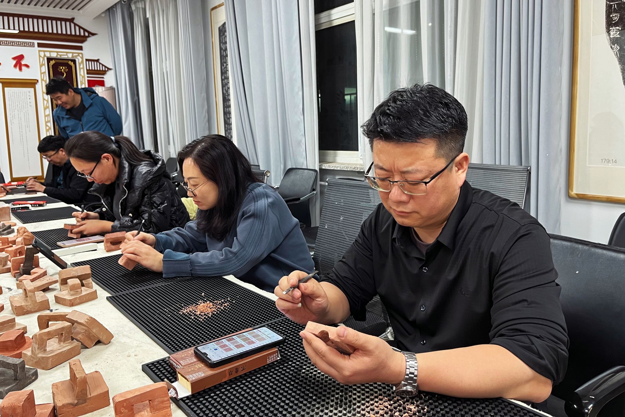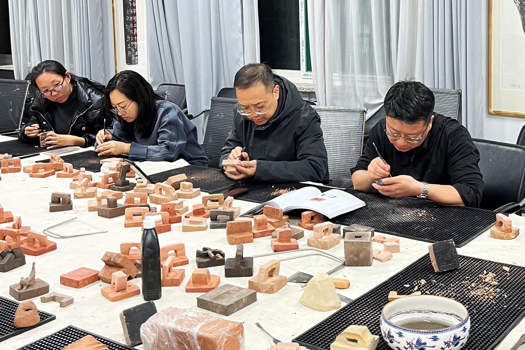 活动伊始,pa捕鱼官方网站技法教研室主任王建魁邀请阴凤华老师对陶瓷印的相关知识进行讲解。阴老师结合自己制作的“由土而生”、“窑火唤彩”、“瓷光初现”、“和敬清寂”、“水墨青花”等系列作品,全面讲解了陶瓷印的发展历史、制印技巧、刊刻流程、烧制工艺等知识。讲解结束后,阴老师现场进行了示范,展示了刊刻技巧、说明了设计理念。随后,老师们在拿到事先素烧过的瓷印泥块后,先进行印纽的设计雕刻及印面打磨,之后根据所刻文字内容,进行或阴或阳的刻制,阴老师全程进行了辅导。