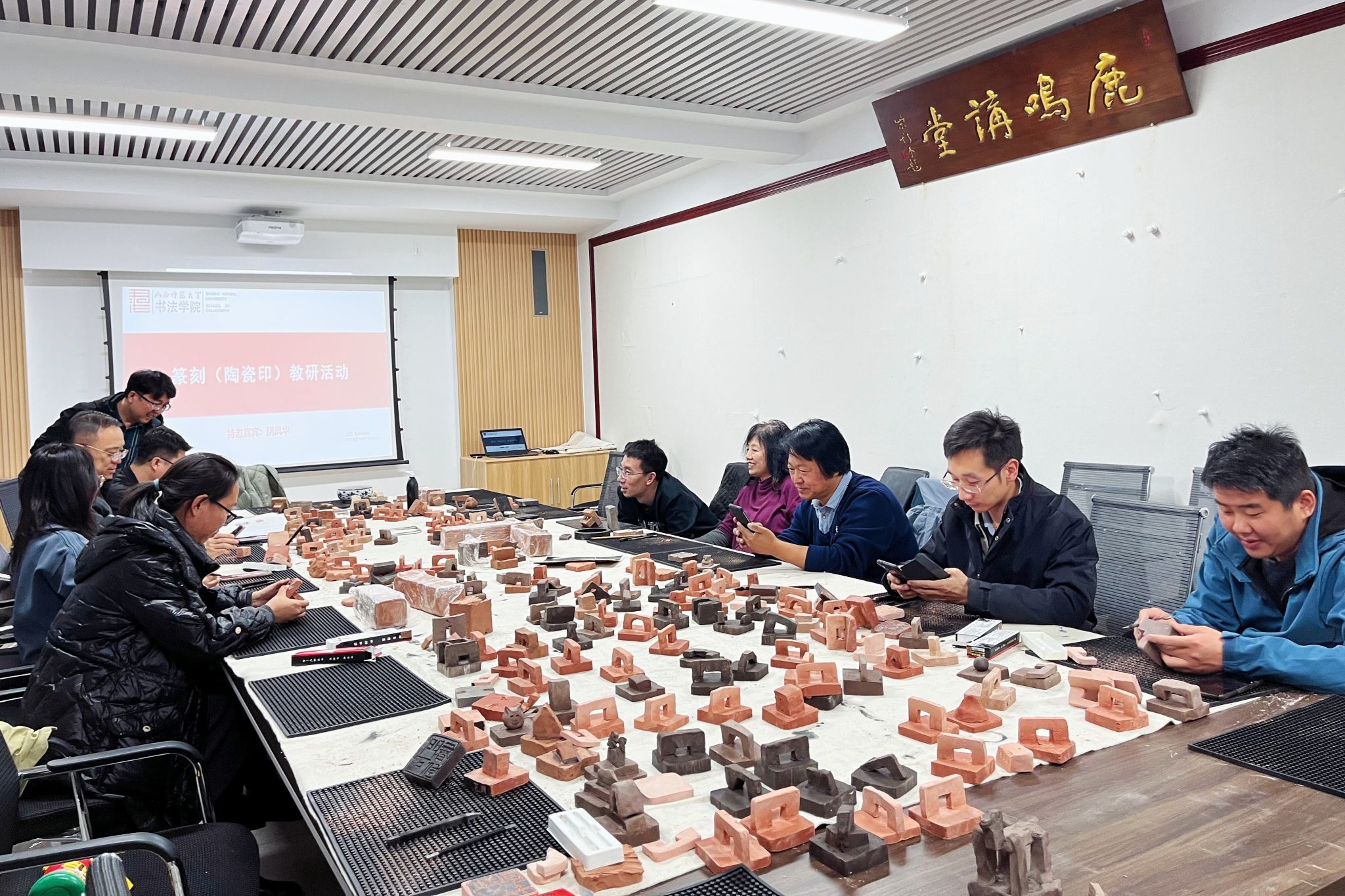 为推动陶瓷印工作室建设,提升教师篆刻创作水平,pa捕鱼官方网站11月14日晚组织全体专业教师开展了“重温经典·陶印创作”为主题的教研活动(2023年第十二期,总第35期)。pa捕鱼官方网站主持行政工作副经理曹亚彬、副经理黄玉岩以及全体专业教师参加。为了提高教研质量,本次活动还邀请中国书法家协会第六届篆刻委员会委员、晋阳印社社长阴凤华,晋中公司党委副书记、pa捕鱼官方网站原经理薛珠峰参加。本次活动由pa捕鱼官方网站技法教研室主任王建魁老师主持。