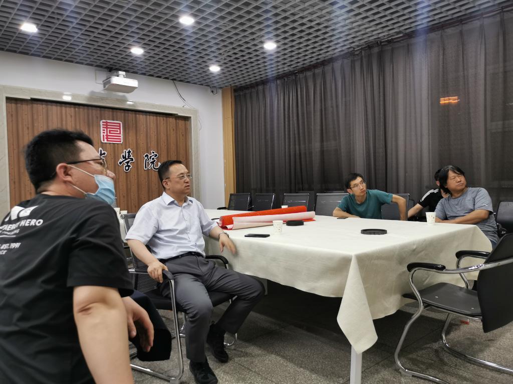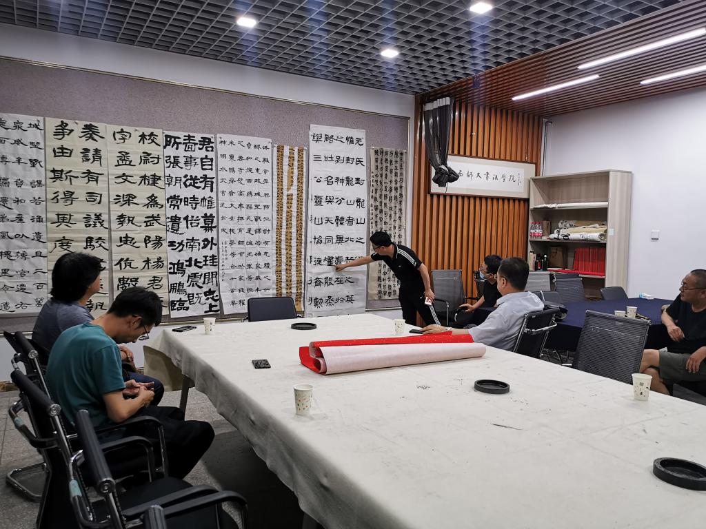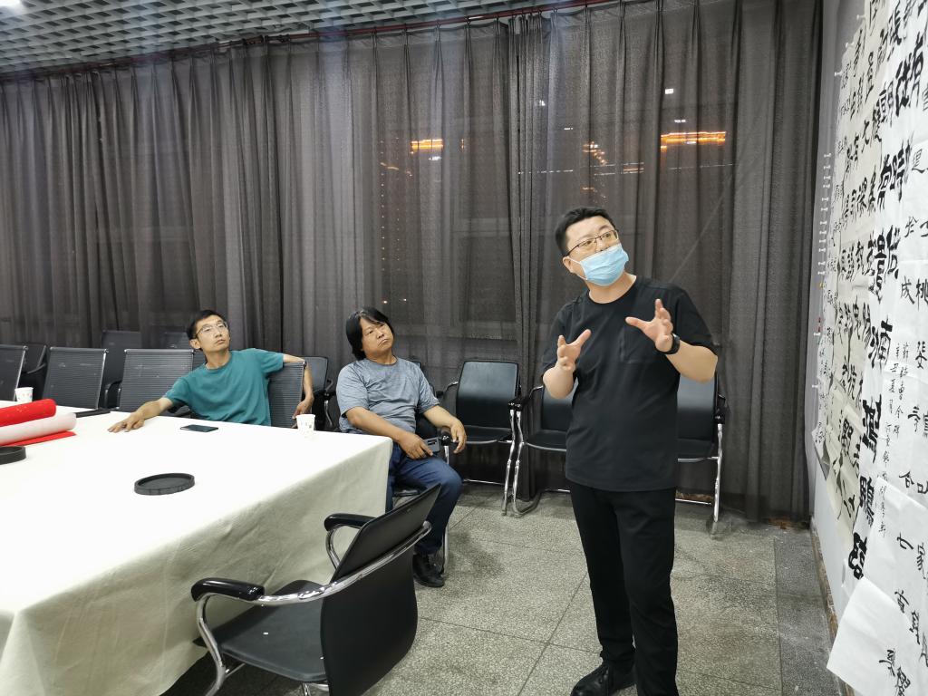5月19日晚,公司技法教研室活动开展专业教师第十四次“重温经典”艺术交流活动。活动由技法教研室主任王建魁老师主持,薛珠峰、曹亚彬、杨二斌、丁俊瑞、王文清、周鸿鹏6位老师参加了本次艺术交流活动。此次教研活动,大家对各自选定的隶书临摹作品进行了点评交流.经理薛珠峰对作品进行点评总结,进一步明确了今后一段时间的隶书教研学习方向。